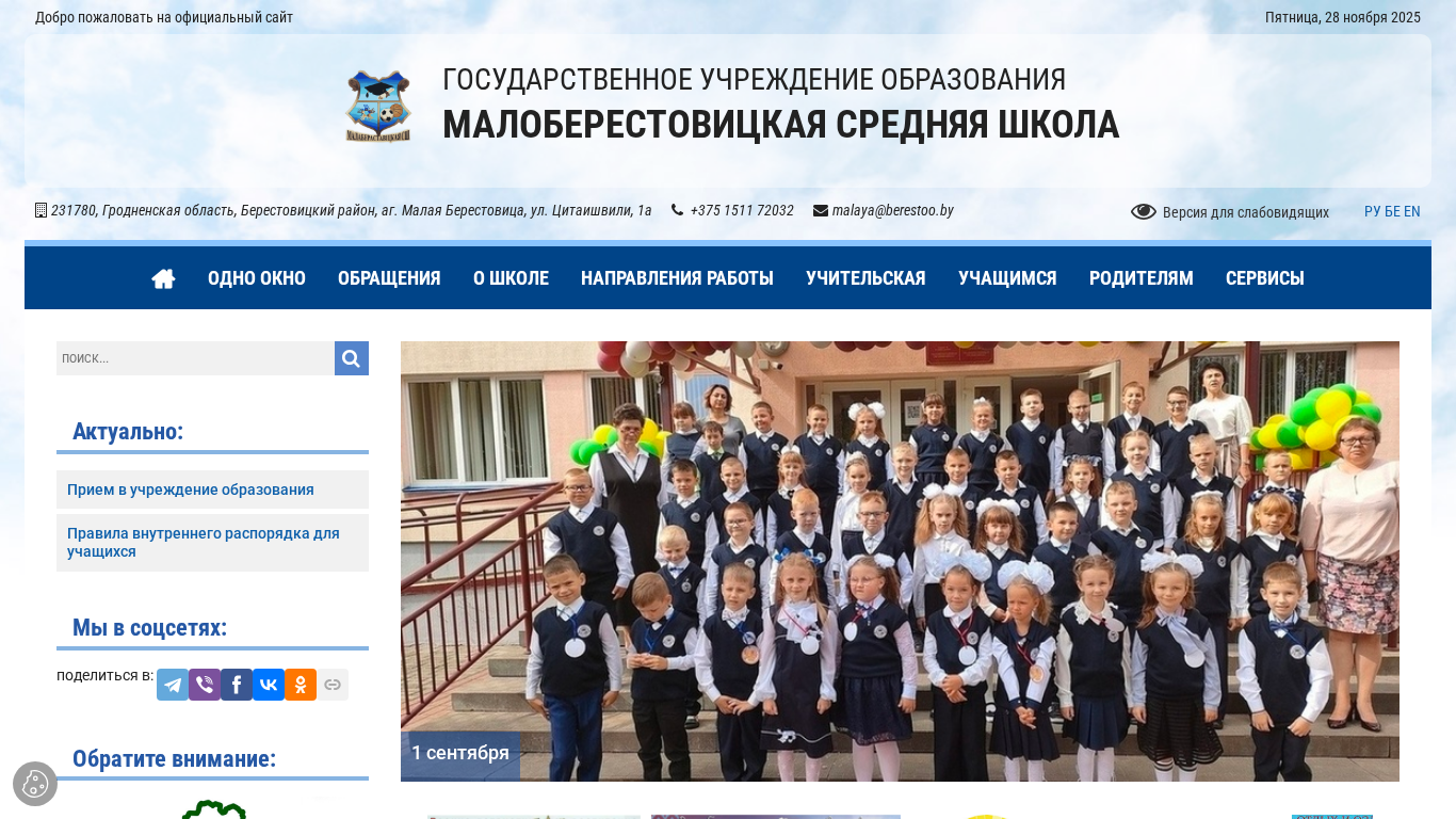 | Адрес | Малоберестовицкая средняя школа, 231780, Гродненская область, Берестовицкий район, аг. Малая Берестовица, ул. Цитаишвили, 1а |
