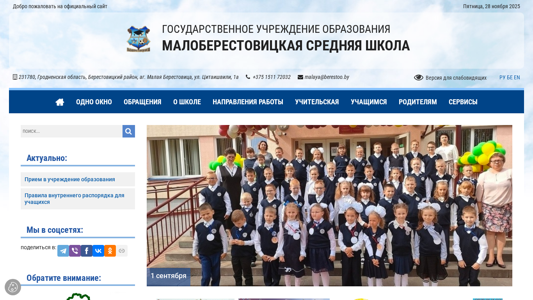 | AI-анализ | --- The web project "Малоберестовицкая средняя школа" is the official website of a state educational institution located in the village of Малая Берестовица, Bерестовицкий район, Гродненская область, Belarus. The site provides information on the school's administrative procedures, normative documents, and contact details. Visitors can find details about the school's leadership, working hours, and rules for filing appeals. Additionally, there are sections on the school's history, innovations, and community involvement. The site is accessible in multiple languages, including Russian and English, and offers an electronic application system. The school's mission, policies on personal data processing, and anti-corruption measures are also outlined on the site. Other features include a people's history museum, a health and wellness center, and information on partnerships with religious |