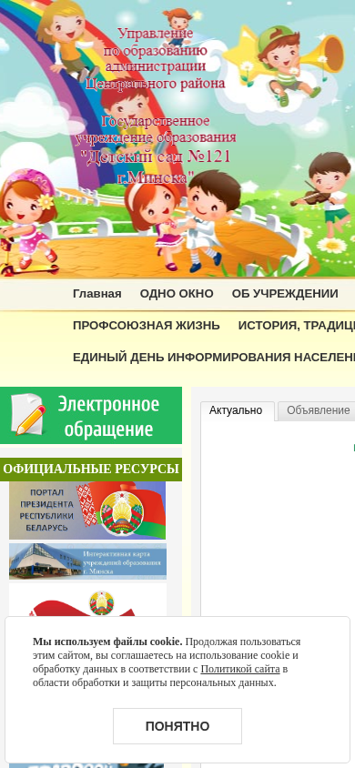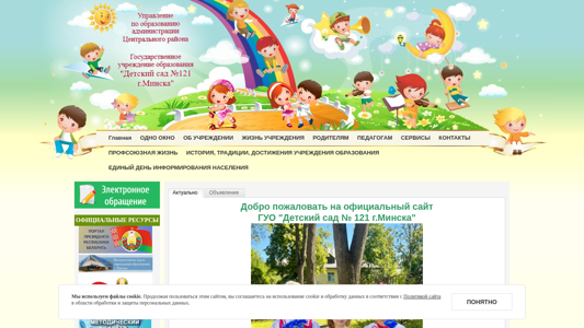 | AI-анализ | --- This online resource is a website for a kindergarten in Minsk, Belarus, named "Детский сад №121" (Children's Kindergarten No. 121). The title and description include keywords related to the kindergarten, such as "сад 121 минск" (saд 121 минск, or Kindergarten 121 Minsk), "ясли-сад 121" (ясли-сад 121, or Kindergarten-Nursery 121), "садик 121 минск" (садик 121 минск, or Kindergarten Garden 121 Minsk), "дошкольное учреждение 121" (дошкольное |