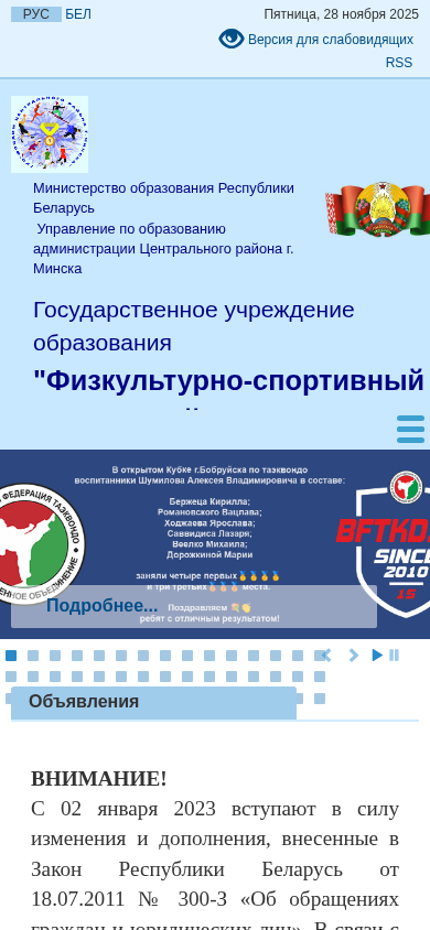 | Адрес | дополнительного образования, Учителю физической культуры, Профсоюз, Новости и события, БЕЛАЯ РУСЬ, 220000 г. Минск ул. Школьная 11 |