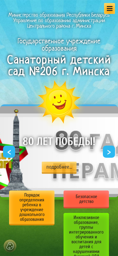 | AI-анализ | This online resource belongs to the Sanatornyy Detskiy Sad (Sanatorium Children's Garden) No. 206 in Minsk, Belarus. It is an interactive educational map featuring information about the institution, its structure, working hours, admission procedures, and contacts. The website includes sections on the administration of the Central District, the Committee of Education of Minsk City Executive Committee, and the Ministry of Education of the Republic of Belarus. It also provides information on the rules for enrolling children, reasons for dismissal, and various educational policies and initiatives such as inclusive education and the project "Inclusive Education: A Favorable Environment for Realizing Each Child's Potential." The website offers resources for parents and legal representatives, including safety guidelines, rules for visiting the institution, and information on additional educational services available on a paid basis. The site also includes pages for the pedagogue |