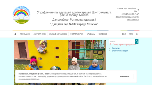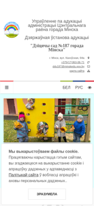 This online resource is the official website of the "Children's Garden No. 187" educational institution located in Minsk, Belarus. The title of the website is given as "Дзіцячы сад №187 г.Мінска" in Belarusian. The description contains information about the use of cookies and contact details for the institution, including its address, phone numbers, and email address. The website is operated by the Administration of Education of the Central District of the City of Minsk, and provides information about various educational services, including kindergarten groups, vacancies for pedagogical workers in 2025, and various educational programs and events. The website also features a photo gallery and an archive of news. The institution is open from Monday to Friday and offers various educational services for children, including rhythmic gymnastics, and recommends a healthy lifestyle