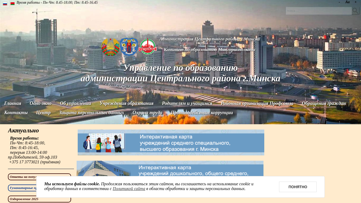| AI-анализ | This website, titled "УО Центрального района," is primarily about the Central District Education Administration in Minsk, Belarus. Keywords associated with the site include "education," "Central District," "Minsk," and "administration." The description mentions various topics related to education, such as "school year 2025/2026," "externals 2025," and "childcare registration." The site also provides contact information, including phone numbers for various departments and a hotline for reporting child abuse. Additionally, the site mentions various projects and initiatives, such as "humanitarian projects," "ozone revival 2025," and "targeted preparation 2025." The website operates from Monday to Thursday, 8:45 AM to 6:45 PM, and Friday, 8:45 AM |