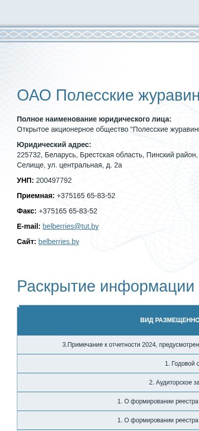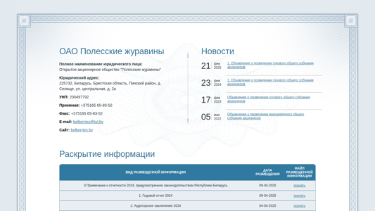 | AI-анализ | This online resource is the official website of Open Joint Stock Company "Polessky Zhuraviny" (ОАО Полесские журавины). The company's full legal name and registered address are provided, along with its Unified State Register number (ЕДРПОУ) and contact information, including phone, fax, and email. The website includes announcements for shareholder meetings, with multiple notices for annual and extraordinary general meetings dating back to 2021. Additionally, various financial reports and auditor's conclusions are available for download, as required by Belarusian legislation, dating back to 2020. Furthermore, information on the formation of shareholder registers is also accessible. |