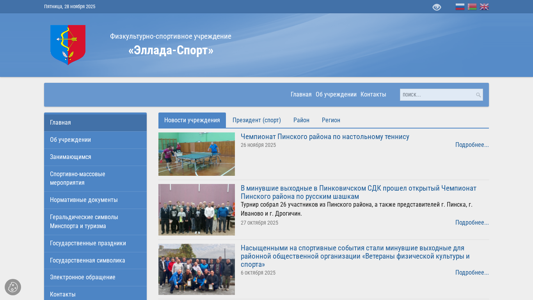 | AI-анализ | --- The website ellada.pinsk-region.by is dedicated to the sports activities and events organized by the physical and sports institution "Ellada-Sport" in the Pinsk region of Belarus. The main page provides information on ongoing and upcoming sports championships, including those for table tennis, football, and darts, as well as past events. The website also features sections on safety, health, and information about cybercrime prevention. Additionally, there are sections for contact information, administrative details, and links to various regulatory documents and symbols. The website is operated by the Ministry of Sport and Tourism of Belarus. |