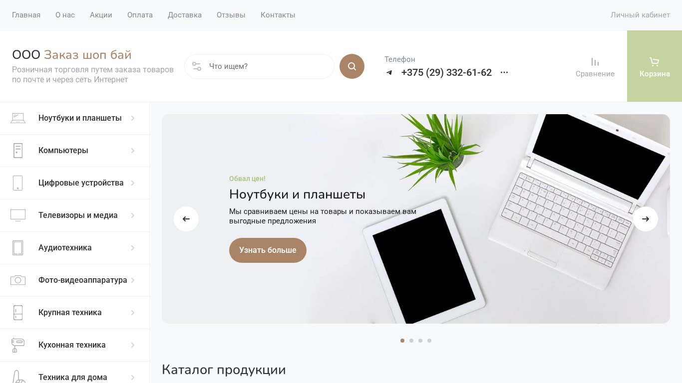 | AI-анализ | --- The portal is an electronic and household appliance e-commerce website offering the opportunity to create, order, develop, and open an internet shop for electronics and household appliances with Megagroup.ru. The website provides a range of products including televisions, quadcopters, laptops, tablets, printers, monitors, digital devices, smartwatches, and smartphones. Users can compare items, add them to their cart, and make a purchase. The website also offers various deals, payment options, and delivery services. Customers can check product availability, quantity, and reviews before making a purchase. The contact information and a personal cabinet are available for registered users. The website is designed for both wholesale and retail customers and allows users to order products by mail or through the internet. |