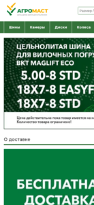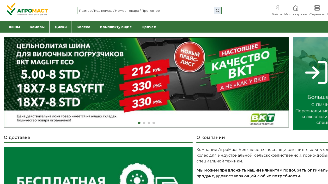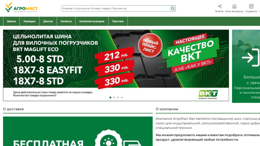 The web project "OOO "АгроМаст Бел" is an e-commerce website run by a Belarusian company specializing in the sale of tires, steel wheels, cameras, disks, rims, and other components for industrial, agricultural, mining, and other specialized machinery. The site offers clients the ability to select the optimal product for their needs and provides information and support from key partners. The homepage includes links to various services such as a shopping cart, delivery information, company details, and contact information. The domain is shop.agromast.by.