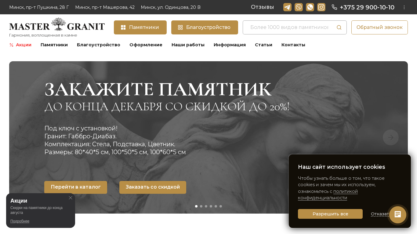 | SEO-описание | Заказать гранитный памятник на могилу - цена с доставкой по всей Беларуси. Изготовление и установка памятников из гранита на заказ, срочно. Каталог памятников из гранита с фото. 🕯️ Гарантия 10 лет, рассрочка 0% и бесплатное хранение. 📞 Закажите памятник под ключ по номеру +375 29 900-10-10 |