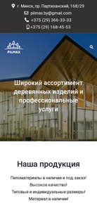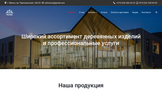 | AI-анализ | --- The web project "ПИЛМАКС | Купить пиломатериалы в Миnске | термодревесина - PILMAX.BY" is a website based in Minsk, Belarus, selling various types of timber materials, including pine and Siberian larch, as well as thermo-wood and hidden screws. The site offers a wide range of products for interior and exterior decoration, landscaping, and garden furniture, with services such as consultations, project planning, and installation also available. Users can contact the company using the phone numbers +375 (29) 366-33-33 or +375 (29) 168-45-53. The site also includes a catalog of products, including pilings, self-drilling screws, and various types of |
