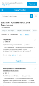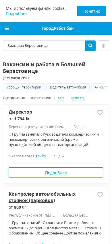 --- The web project "Bolshaya Berestovitsa.GorodRabot.by" is a job search platform dedicated to vacancies and employment opportunities in the town of Bolshaya Bereстоvitsa. With over 139 current job listings from local employers, users can quickly and conveniently find employment within the town. Job categories include various skilled and unskilled positions such as cleaner, driver, economist, salesperson, director, and many more. Users can sort vacancies by relevance to salary, date, or distance. The website is operated by Belarusian state enterprise "Berezitskoe Unitarnoe Kommunalnoe Predpriyatie Bytovogo Obsluzhivaniya Naseleniya Bolshaya Bereostovitsa" and is primarily intended for job seekers in the town, with