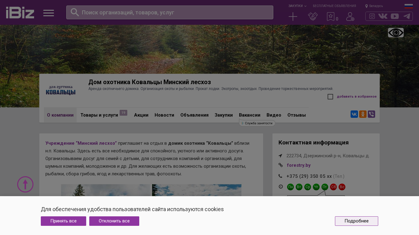 Название / ЗаголовокДом охотника Ковальцы Минский лесхоз - Аренда охотничьего домика. Организация охоты и рыбалки. Прокат лодки. Экотропы, экоотдых. Проведение торжественных мероприятий.. 222734, , Ковальцы д.