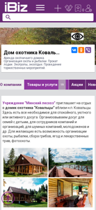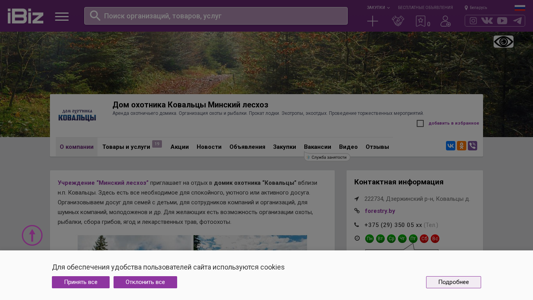 The web project "Dom ohotnika Kovaltsy Minsk leshoz - Arenda ohotnich'ego domika. Organizatsiya ohoty i rybalky. Prokat lodki. Ekotropy, ekootdyh. Provedenie torzhestvennyh meropriyatii.." (Hunter's House Kovaltsy Minsk Leshoz - Rent of Hunter's Cabin. Organization of hunting and fishing. Boat rental. Ecotourism, ecovacation. Organization of ceremonial events..) is a Belarusian .BY domain dedicated to offering a hunter's cabin for rent, organizing hunting, fishing, and ecotourism activities, as well as providing boat rental and ceremonial event organization services. The domain also includes a map, contact information, and an address in the