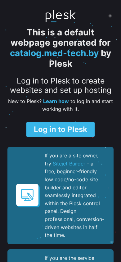 | AI-анализ | language: en country: BY The web project catalog.med-tech.by is a default page generated by Plesk, a hosting control panel. The page invites users to log in to Plesk to manage websites and hosting services. For new users, there is a link to learn how to log in and start working with it. Additionally, the page promotes Sitejet Builder, a free, beginner-friendly site builder integrated within Plesk, and WP Guardian, a WordPress protection tool. Plesk is a comprehensive hosting control panel designed to help web professionals manage various services through a user-friendly interface. It includes tools for web, DNS, mail, and other services management. Plesk is known for its intelligent management of servers, applications, websites, and hosting businesses, both on traditional and cloud hosting. |