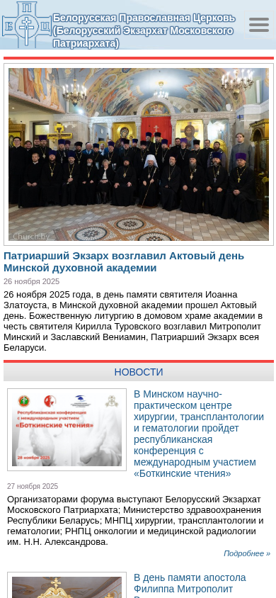 The portal <Beлорусская Православная Церковь (Белорусский Экзархат Московского Патриархата)> is a religious website dedicated to the Belarusian Orthodox Church under the jurisdiction of the Moscow Patriarchate. The site offers news, photos, and videos related to the church, its hierarchy, and various events. It includes sections on the history of the church, the lives of its leaders, and the organization of its dioceses. Additionally, the site provides access to documents, journals, and publications related to the church and Orthodoxy in general. The domain name is <ftp.church.by>.