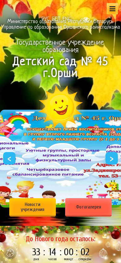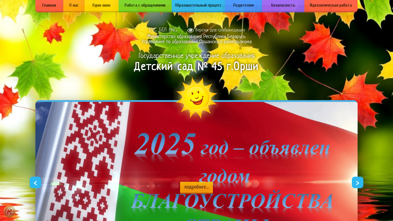 | AI-анализ | --- This website belongs to Detsky Sad No. 45 in Orsha, Belarus. The title of the website is "Детский сад № 45 г.Орши" (Children's Kindergarten No. 45 in Orsha). The description section contains information about the kindergarten's registration documents, admission conditions, structure, management, history, and policies related to personal data processing. The keywords include words related to kindergartens, Orsha, registration, conditions, structure, management, history, and policies. The top words indicate that the website contains information about the year 2025, the city of Orsha, kindergarten news, Janska and Krasotkina streets, November, and more. The website also features a news section, a photo gallery, rules for pedagogical workers and parents, a rating evaluation portal, and various services |