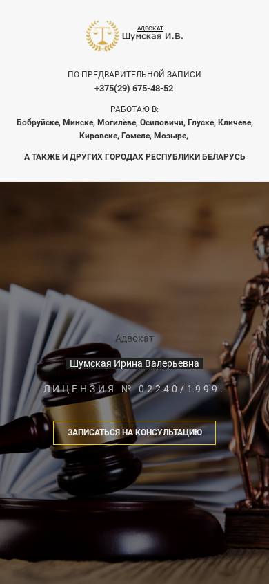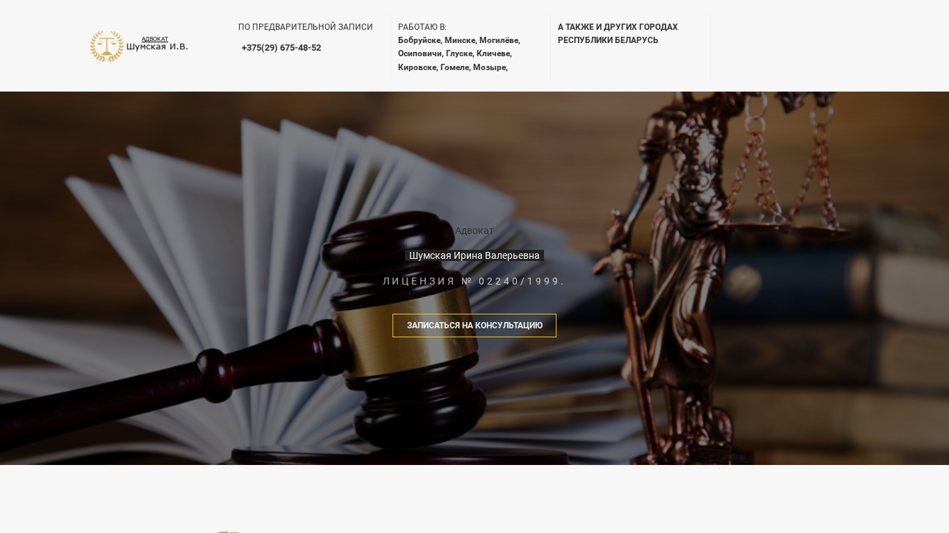 | SEO-описание | Адвокат Шумская Ирина, работаю по всей Беларуси с распространёнными делами - от уголовных до жилищных. |