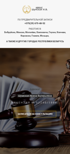 | AI-анализ | This online resource is a website for attorney Irina Shumskaya, who provides legal services throughout Belarus, covering a range of cases from criminal to housing matters. The site includes her contact information, with phone numbers for reaching her in Bobruisk, Minsk, Mohilev, Osipovichi, Guske, Klichevo, Kirovsk, Gomel, and Mozir, as well as other cities in Belarus. Irina Shumskaya has been practicing law since March 10, 2010, and holds license number 02240/1999. She has undergone professional development courses in May 2012, May 2016, and June 2020. The attorney has been awarded honorary grammas by the Mogilev Regional College of Advocates in 2 |