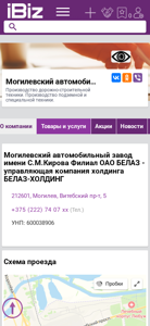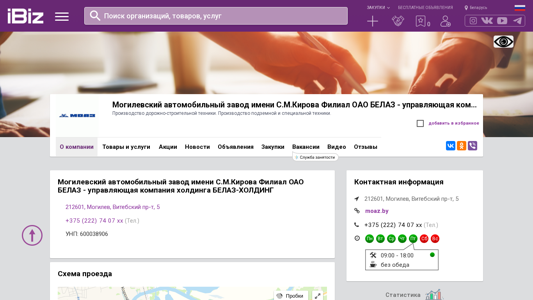| AI-анализ | The website is for Могилевский автомобильный завод имени С.М.Кiрова Филиал ОАО БЕЛАЗ, the managing company of the БЕЛАЗ-ХОЛДИНГ holding company, specializing in the production of road-building and construction machinery, as well as underground and specialized technology. The site includes sections for company information, products and services, news, job postings, and contact information. It also features a map with directions, business hours, and a telephone number. The website is in Belarusian and is operated by ООО "АЙБИЗ МЕДИА" - Каталог предприятий и организаций Беларуси. |