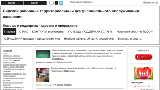 | AI-анализ | The website is the homepage of the Lidsky Regional Territorial Center for Social Services to the Population, offering assistance and support to the residents of the Lidsky region in Belarus. Key topics include social services for the disabled, contacts and requisites, news and events, and various services such as care and guardianship. The website is rich in information about the structure of the organization, its administration, and services provided, including support for veterans, job opportunities, and community outreach initiatives. It also features sections on financial literacy, safety, and preparation for the academic year. The website is committed to providing long-term services until 2030 and offers a hotline for preventative measures against domestic violence. The website's news section covers local, regional, and national news, as well as events related to the center's activities. The website has an active social media presence and a tele |