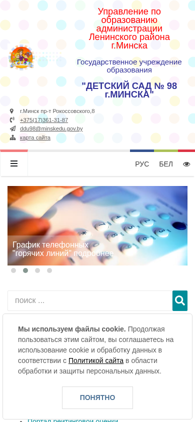 | Адрес | Ленинского района г. Минска, Государственное учреждение образования, "ДЕТСКИЙ САД № 98 г. МИНСКА", г. Минск пр-т Рокоссовского,8 |