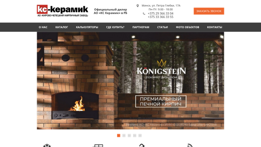 | AI-анализ | --- This online resource is the official website for OOO "Pechnoy Tsentr," the distributor of AO "Kirovo-Chepetsky Kirechniy Zavod" (KCZ) and the representative of TM KS-Keramik's building ceramic products in Belarus. The company invites partners in various regions to collaborate. The website provides information about the company's location in Minsk, contact details, and a catalog featuring various collections, such as Edelhaus, Königstein, and Master Keramik, along with their respective full and hollow versions. The website also includes a calculator for estimating the amount of required bricks, product specifications, and contact information. The main product categories include clinker, Edelhaus, and various types of hollow and full ceramic bricks. Some popular items include Königstein's Marxs |