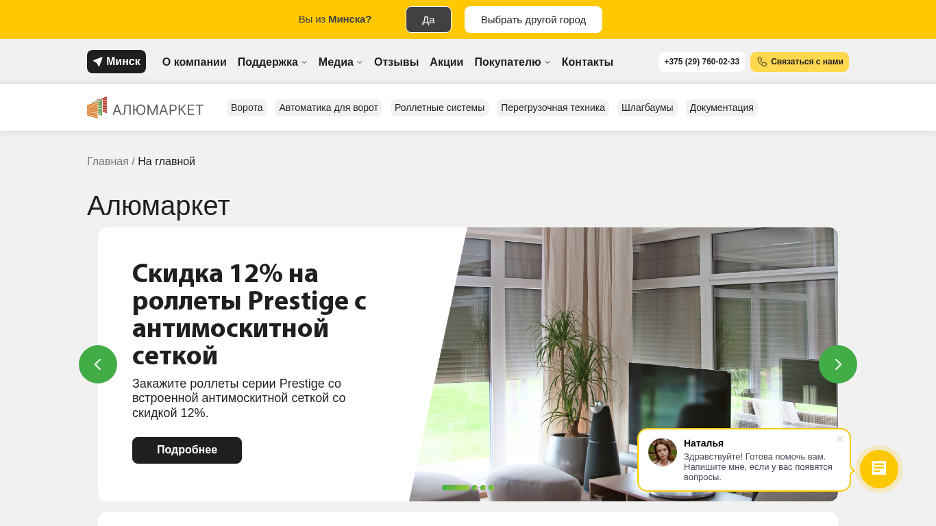 | AI-анализ | --- The website "Алюмаркет" (Alumarket) offers various types of gates including sectional, roller, panoramic, swing, and industrial gates. It also provides automation systems, rolling doors, and loading equipment. Users can calculate the cost of their desired product using the calculator feature. The company offers delivery and credit services, as well as installation and warranty support. The website includes a contact section for users to get in touch with the company in Borisov, Belarus. The domain is "minsk.alumarket.by". |