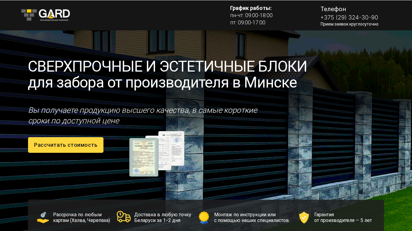 | AI-анализ | The web project "Gard-Block.by" is an e-commerce platform for buying concrete blocks for fences at an affordable price with delivery across Belarus. The company produces European-quality concrete blocks in-house near Minsk, with a minimum lifespan of 30 years. Services include delivery, self-pickup from the warehouse, free design project development, and simple installation instructions. The product comes with a 3-year manufacturer's warranty and complies with the relevant GOST standards. The website offers high-strength and aesthetically pleasing blocks for fences, with various heights, widths, and thicknesses available. Users can calculate the approximate cost based on the length of the fence, height of the fence (stiles), and width of the gaps between the stiles. Delivery is available to all parts of Belarus within 1-2 days, and financing options |