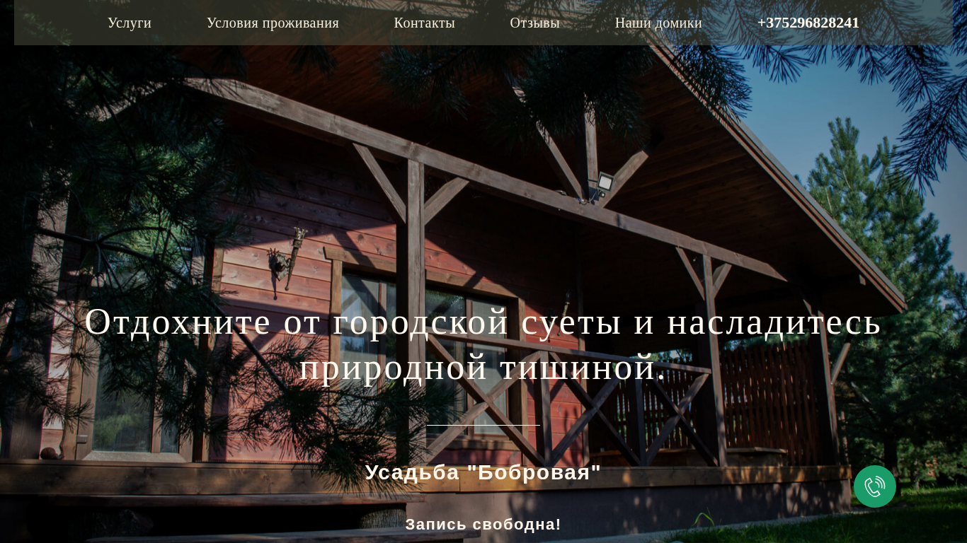 | AI-анализ | The website "Bobrovaya.by" offers vacation services at the "Bobrovaya" estate located near Minsk, Belarus. The estate features a sauna, hot tub, fireplace, private pond, and a river called Sula for fishing and rafting. The accommodation includes a kitchenette with a refrigerator, microwave, kettle, and necessary dishes; a bedroom with a comfortable sofa bed, warm blankets for cold nights; a smart TV with internet access; a fireplace for cozy evenings; a bathroom with a shower and a sauna. The estate also provides a Wi-Fi network throughout the property. Ernest Hemingway once wrote, "The banya is a sacred place - a place of union of the four elements, where you can wash away weariness, tension, and bring order to your weary soul and tired body." The estate aims to make your |