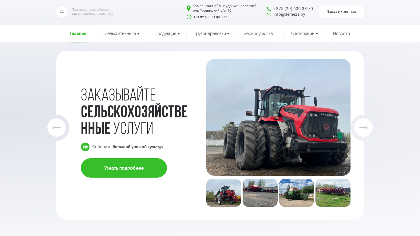The portal Demeza.by offers agricultural services to farming enterprises, including agricultural work and services for agriculture. For more information, contact +375 (29) 609-38-70. The company is located in the Gusevitsky district, Buda-Koshelevsky region, in the village of 10 G. Homiel, ul. Polesskaya, 57a. Open from Monday to Friday from 8:00 to 17:00. Agricultural services provided include tractor services, land preparation, seeding technology, pesticide application, crop harvesting, loader services, cart services, excavator services, grain silos, corn, rapeseed, wheat, barley, oats, peas, and soybeans for sale, grain drying, and cargo transportation services.