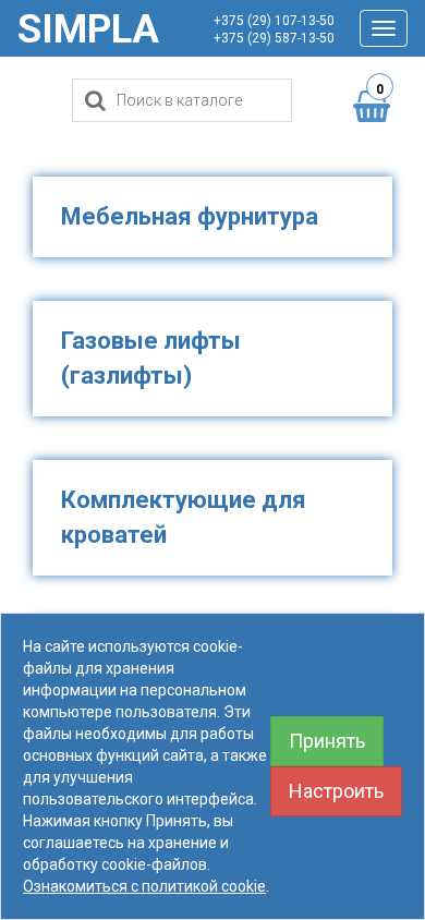 This online resource is an e-commerce website for furniture components and accessories, named "Симпла" (Simpla). It offers a catalog of furniture fittings and parts with prices, photos, and descriptions. The website boasts a wide range of products and low prices, with delivery available in Belarus. Visitors can find various types of lifting mechanisms, including those for shelves, transforming mechanisms like "Дельфин" and "Пума," mechanisms for beds and tables, as well as gas lifts, springs, and connectors. The catalog includes items for children's beds, such as gas springs and mattress covers. Additionally, the website offers various types of supports, gas lifts, and undercarriages for furniture. The contact information provided is a phone number for customer inquiries.