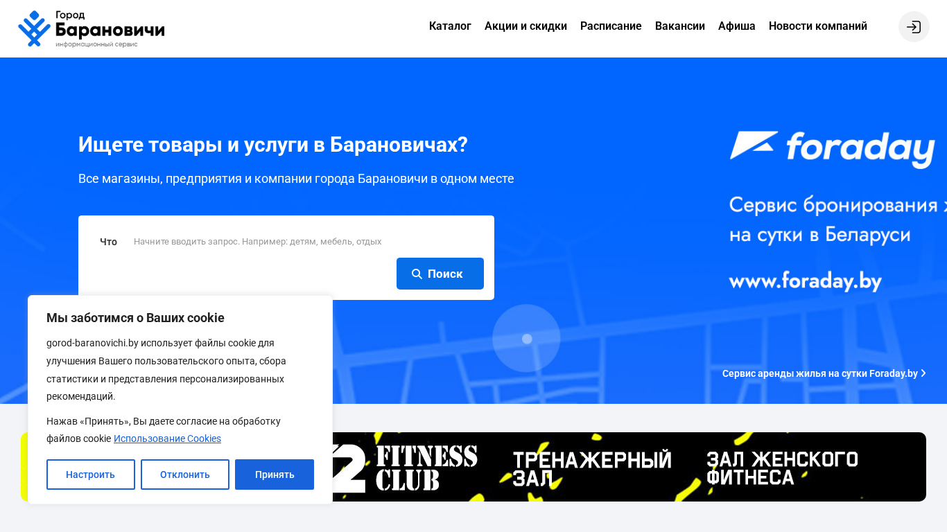 | SEO-описание | Город Барановичи: каталог организаций, акции и скидки, расписание транспорта и много другое. Будьте в курсе актуальной информации и культурных мероприятий. |