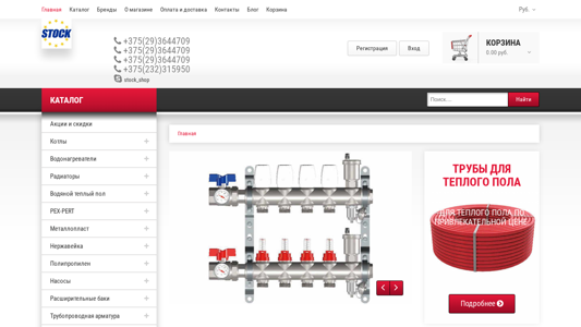 This website is an online store for sanitary and plumbing equipment in Gomel, Belarus, named estock.by. The store offers a wide range of affordable sanitary and plumbing products from top worldwide manufacturers, presented with photos, prices, characteristics, and customer reviews. The website includes sections for brands, shopping cart, payment and delivery options, contacts, and blog. The available payment methods are in rubles and US dollars. The store offers a catalog of products, sales, and discounts on various types of heaters, including tverdotoplivnye (solid fuel) and gas heaters, such as Космос, Житомир Haier Oasis RE/BE, Krats, ЭВАН Next, and others. Products include electric and water heaters, radiators, fittings, pipes, and related accessories. The website also offers installation and maintenance tools, as well