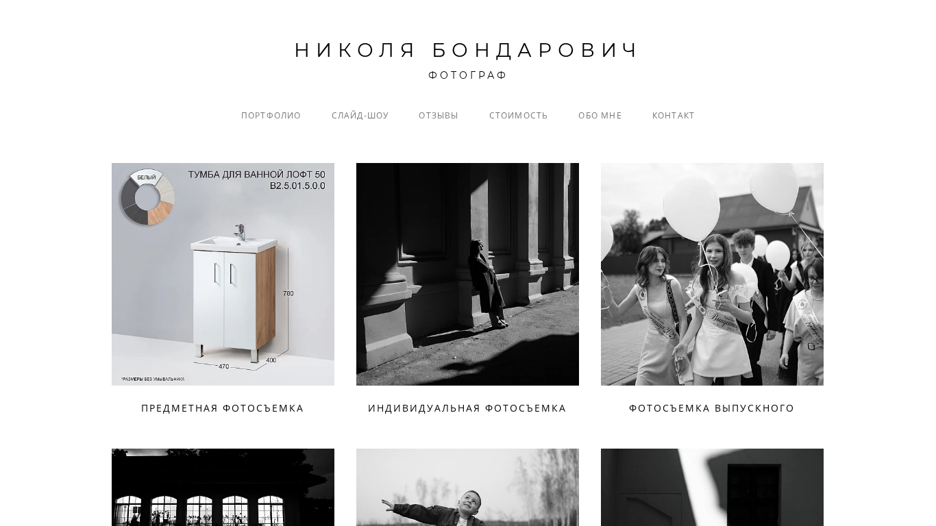 | SEO-описание | Сайт фотографа Николя Бондарович. Я работаю как предметный фотограф в городах Минск, Молодечно, Барановичи |