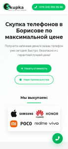 | AI-анализ | The portal borisov.skupkatelefonov.by is a phone buying and selling platform based in Borisove, Belarus. The website offers the highest price for selling phones, with a promise of 10-15% more than competitors due to direct purchases and absence of intermediaries. The process is straightforward: users can contact the team by phone or messenger, receive a preliminary price offer, meet with a specialist for an evaluation, and receive payment immediately after the phone is inspected. The website also operates in several other cities in Belarus. |
