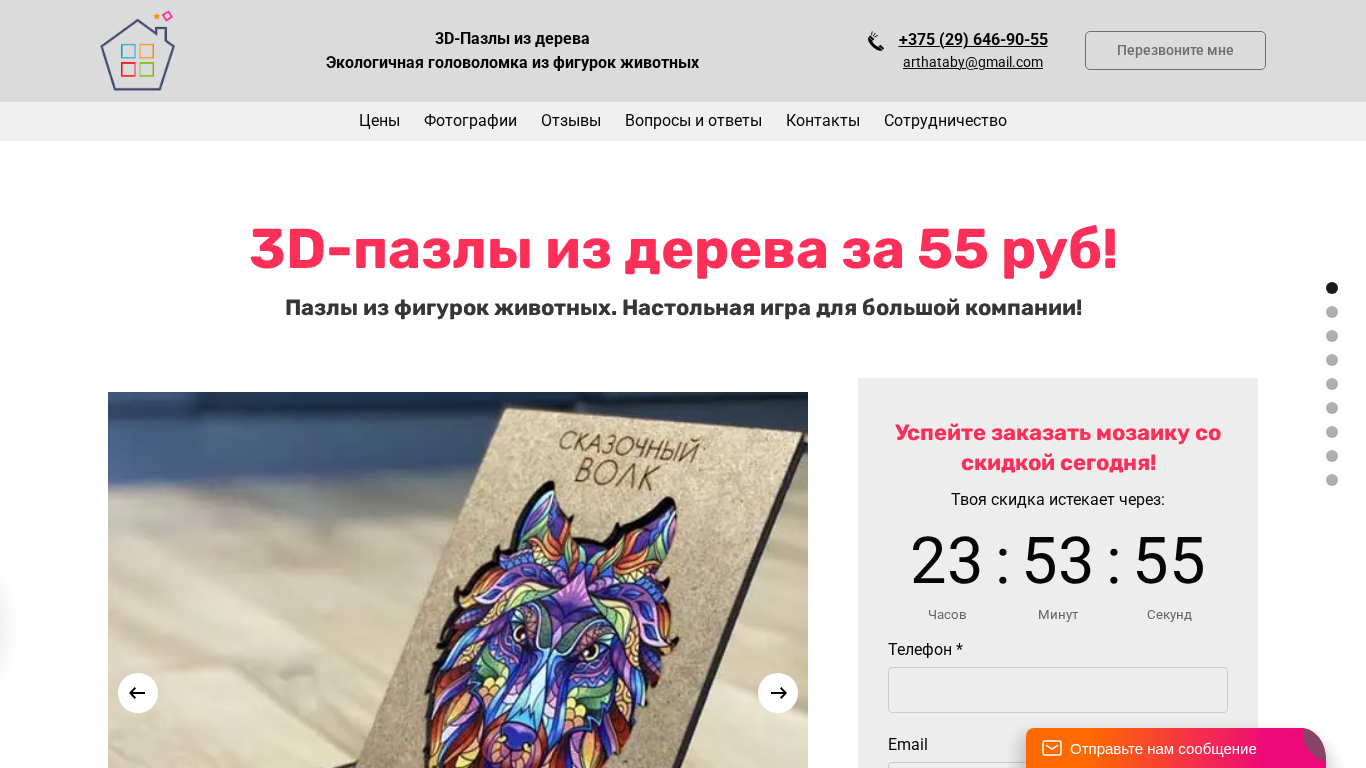 The web project "Puzzle.arthata.by" is an online store offering eco-friendly wooden puzzles and decorative wooden mosaics. The store specializes in designer animal figurine puzzles, with over 150 pieces and a build time of approximately two hours. The puzzles and mosaics are made from various types of wood in Belarus. The website also features information on pricing, customer reviews, and contact details for ordering. The store offers both small and large puzzle sizes, with select pieces priced at 55 rubles. The site includes images of various puzzle designs, including "Magical Bear," "Fairy Wolf," and "Mysterious Fox," and allows users to place orders directly from the product pages. The store also offers a Facebook tracking pixel for marketing purposes.