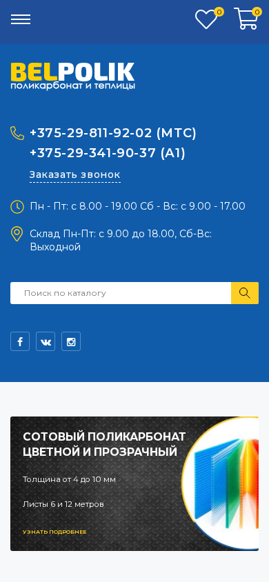 The website Belpolik.by operates an online store selling high-quality greenhouses and gazebos made of polycarbonate. The store offers a range of products including greenhouses, gazebos, summer showers, and polycarbonate sheets in both sheet and monolithic forms. Customers can place orders with delivery across Belarus. Contact information for the store includes phone numbers for MTS and A1 networks. Operating hours are Monday to Friday from 8:00 to 19:00, and Saturday and Sunday from 9:00 to 17:00. The store also offers installation services for greenhouses and gazebos, as well as the assembly of summer showers. The store's catalog features a variety of polycarbonate products, including greenhouses, greenhouse components, and clear roofing sheets, as well as gazeb