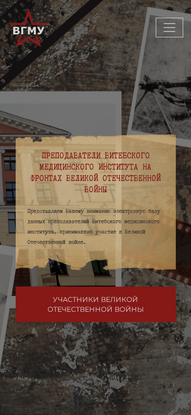 | AI-анализ | The web project "Vovvsmu.lib.vsmu.by" is dedicated to the biographies of professors from the Vitsebsk State Medical University (VSUM), who served on the front lines during the Great Patriotic War. The site provides information on participants in the war, order holders, and those awarded medals. It includes lists of doctors of science, candidates of science, honored doctors of the BSSR, and honored scientists of the BSSR. The main focus is on the professors of the Vitsebsk Medical Institute who fought in the war. The database is a part of the VSUM library and was copyrighted in 2025. |