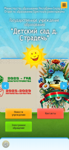 | AI-анализ | The portal "Детский сад д. Страдечь" is a government educational institution website dedicated to a kindergarten in the village of Stradech'. The site provides information about the kindergarten's history, leadership, pedagogical staff, special permission, objectives, admission procedures, policies on data processing, news, and contact details. It also includes information on the educational process, organizational and methodological activities, and various services for parents and children. The site features a rating evaluation system, a schedule for administrative work and public reception, and a section for popular inquiries. Additionally, there are sections on educational requirements, safety rules, and teacher guidelines. The kindergarten offers educational services on a fee-paying basis and has a parents' council and consulting services for parents. The site is operated under the Ministry of Education of the Republic of Belarus and the Brest Regional Executive Committee. |