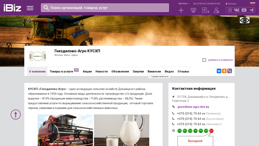 | AI-анализ | The web project "Gnezdilovo-Agrro KUSHP" is a farming cooperative based in Gnezdiolo village, Sovietskaya street, in the Docshitsky district of Belarus. The main activities of the cooperative include the production of agricultural products. Approximately 87.9% of its revenue comes from livestock (71.8%) and crop (28.2%) farming. The cooperative also offers services for growing agricultural produce, wholesale grain trading, and supplying animal feed. The main products of the cooperative are milk, meat, and grain. The cooperative sells these products in their raw form. Its main customers include various agricultural enterprises such as OAO "Moloko" in Vitsebsk, the Lepeль MKK branch of OAO "Vitsebsk Meat Processing Plant |