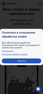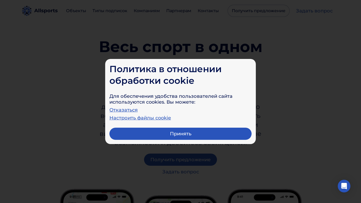 The website is Allsports, a corporate sports subscription service in Belarus, providing access to over 680 sports facilities and 87 types of activities. Companies and partners can obtain a proposal and ask questions through the provided contact information. The company "OLLSPORTS" is registered under UNP 193190172 and has offices in Minsk, Belarus. The site uses cookies for user convenience. Contacts include phone numbers and an email address for client, partner, and technical support. Companies can join Allsports and become partners by providing their name, contact information, and email address.