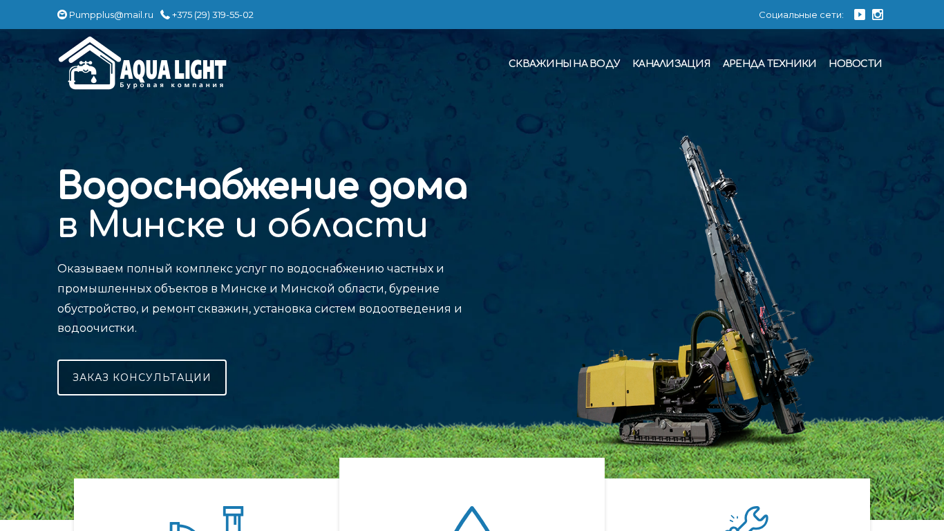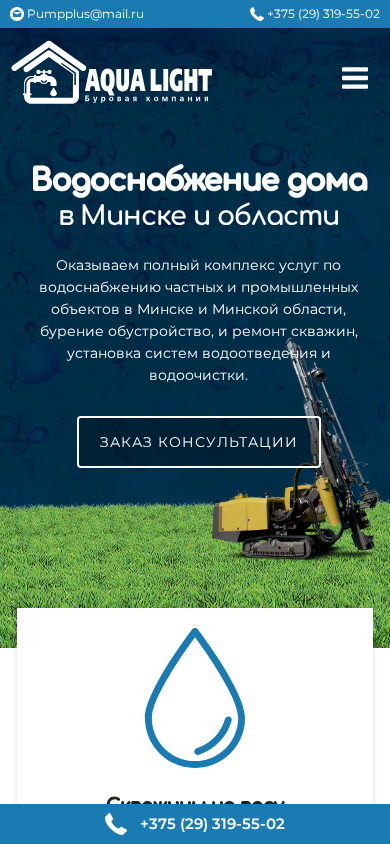 The portal Aqua Light offers comprehensive water supply services for private and industrial objects in Minsk and Minsk region. The company specializes in drilling, installation, and repair of water wells, and provides services for sewage and wastewater systems. With over 20 and 30 years of experience, their team offers a full range of water supply solutions including drilling, installation, and repair of wells, and the installation and operation of sewage and wastewater systems. Services include water well drilling and installation, water system diagnostics and repair, and the rental of equipment. The portal also provides news and updates on water supply services in Minsk and the region.
