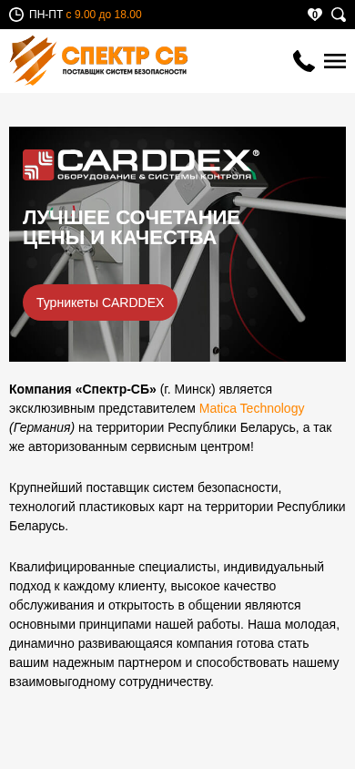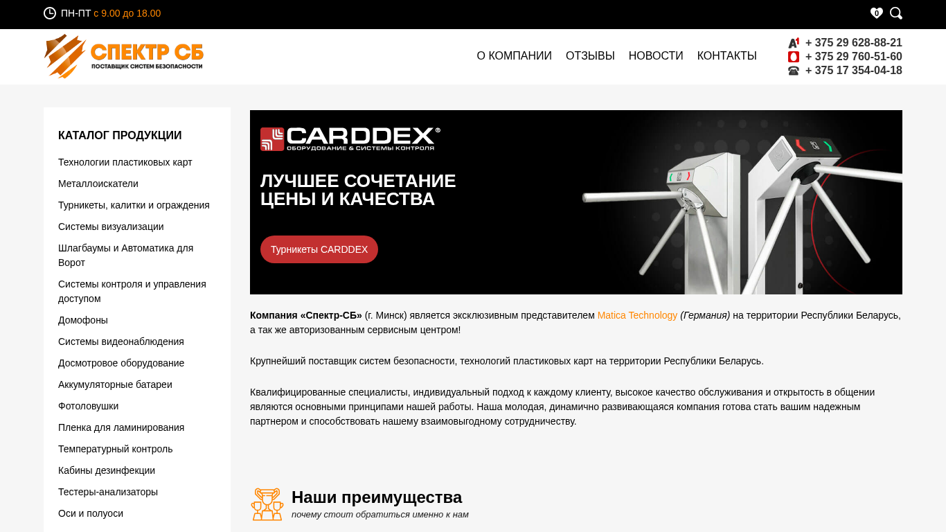 | AI-анализ | This online resource is a business website for Company Spectr-SB, located in Minsk, Belarus, at Chichelinas 21, office 610. The company is an exclusive representative of Matica Technology in Belarus and an authorized service center for this German manufacturer. Spectr-SB is a leading supplier of safety systems and plastic card technology in Belarus, offering qualified support and individual customer service with high-quality assistance and open communication as key principles. The company's young and rapidly developing team is dedicated to becoming a reliable partner and contributing to mutually beneficial collaboration. Spectr-SB offers delivery throughout Belarus, a flexible payment system, and installation services for all types of equipment. The website provides a catalog of products, including monochrome rolls from Datacard, metallic gold GO GREEN 1500 rolls, turntiles from CARDDEX, and various |