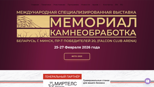 --- The portal Memorialexpo.by is dedicated to the International Exhibition Memorial | Stone Processing. It is the only specialized event in Belarus for the ritual and stone processing industries, providing a unique platform for professionals to meet with partners, clients, and end consumers. The website offers a detailed program, list of participants, news, archives, and contact information for the events held in 2020, 2018, 2017, and 2025, as well as upcoming events in 2026. The site includes photo and video galleries, program information, and participant catalogs for each year. Additionally, there is a section for news, archives, and contacts for the English and Russian language versions of the site. The exhibition takes place over three days and offers intensive learning opportunities for partners of the event. The site also features various partnership options.