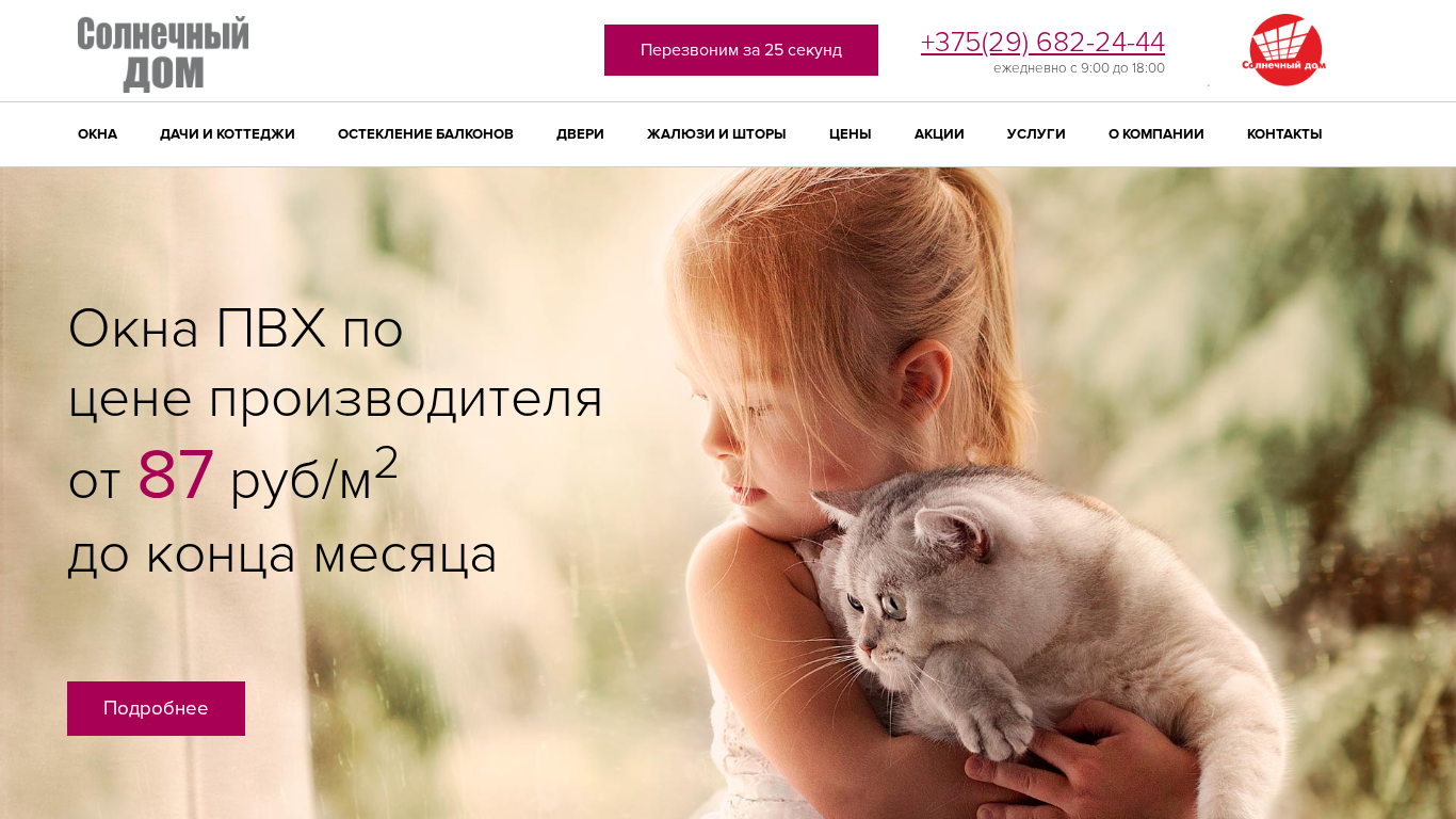 SEO-описание«Солнечный Дом» производит и устанавливает ПВХ окна из качественного немецкого и российского профиля . Производство на собственном заводе в Могилеве позволяет нам предлагать клиентам изготовление конструкций любых форм и размеров по самым низким ценам. Также доступен широкий выбор дополнительных опций.