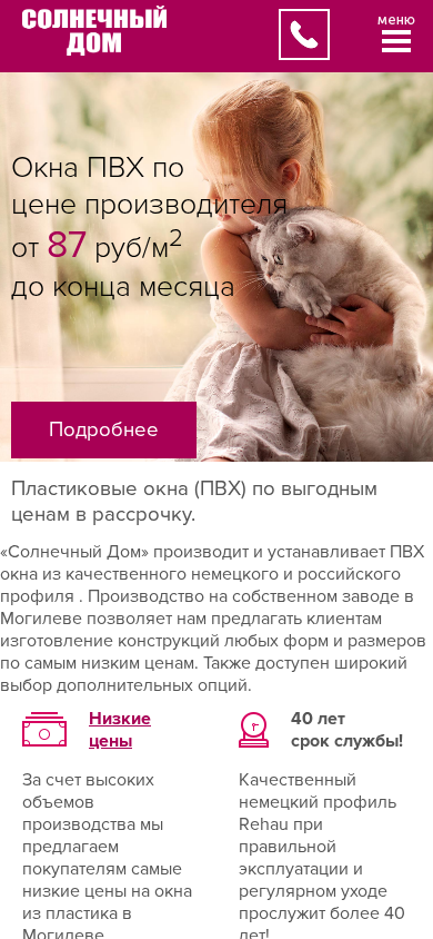 language: ru The website, pvh-okno.by, offers PVC windows for sale at manufacturer prices with installment plans. The company 'Солнечный Дом' manufactures and installs PVC windows using high-quality German and Russian profiles. The in-house production in Mogilev allows for the offer of custom-made windows in various sizes and forms at the lowest prices, along with a wide range of additional options. The website lists various window models and their prices, including BRUSBOX SUPER AERO 70, BRUSBOX AERO 60, REHAU Blitz New, REHAU Grazio, BRUGMANN 2DL, SALAMANDER 2D, SALAMANDER STRIMLINE 76, VEKA Softline, KBE, and others. The website also provides information on