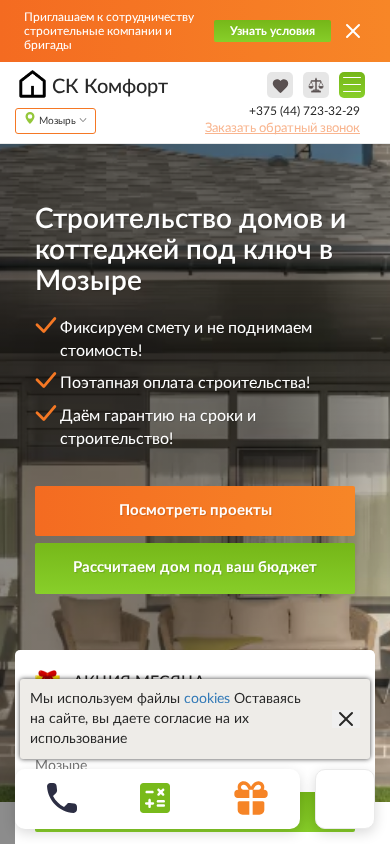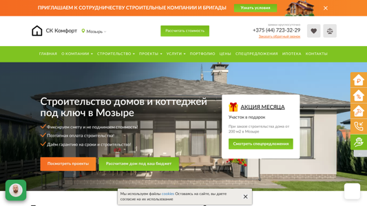 | AI-анализ | --- The web project "SK Comfort" offers construction of houses and cottages in Mozir and the Homel region with unique projects and high-quality buildings at affordable prices. The company provides comprehensive building from foundation to roof. Keywords: homes, personal data, timber, sauna, construction, foundation, house, ruble, agreement, birch, material, treatment, step, treatment process, under, brick, gas block, carcass houses, SIP panels, LSTK, garage, project. The company invites construction companies and teams to cooperate. For details, visit mozyr.dom-stroy.by. The company is located in Minsk, Belarus. Contact information: +375 (44) 723-32-29. Services include earthworks, foundation construction, and roofing. Foundation types include poured concrete, pile foundation |