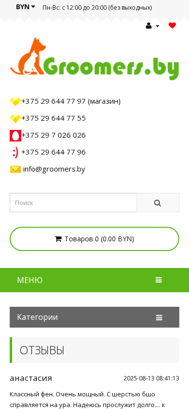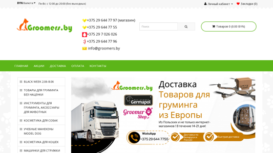 | AI-анализ | The website Groomers.by is an e-commerce platform selling grooming products and tools for pets and groomers. It offers a wide range of pet grooming supplies from various brands including Moser, Wahl, Artero, Iv San Bernard, Andis, White Rose, Komondor, Milord, and many others. The website is available in the BYN currency with Belarusian ruble denomination and operates from Monday to Sunday, from 12:00 to 20:00 without weekends. The platform includes features for personal account registration, authorization, and saved items. The website's top keywords include "byn," "корзину," "andis," "стрижки," "wahl," "животных," "komondor," "нож," "машинка," and "groomers." It also features sections for sales, delivery, |