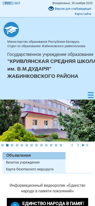 | AI-анализ | The website "Кривлянская средняя школа" (Krivlyany Secondary School) is a Belarusian educational institution located in the Žabinka district. The school, named after V.M. Dudarya, provides education for children and adolescents with a standard, medium, and large font size A-A+ text and standard spacing. The website's color scheme is white, and images are turned off with a checkered background. The school's administrative body's work hours and citizens' reception schedule are posted, along with information on administrative procedures, application forms, and electronic applications. The site also includes contacts for emergency assistance for the disabled and a licensing document for the right to conduct educational activities. The objectives and tasks of the school, as well as its position on handling personal data, are stated. The site covers topics such as military-patriotic education, |