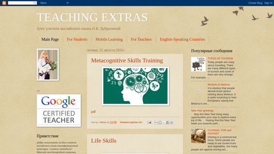 | AI-анализ | This online resource is a blog by a qualified English language teacher, I.V. Zubrilina, from the Minsk International Gymnasium. The blog provides various educational resources, including pdfs on metacognitive skills training, life skills, creativity, critical thinking, lesson modeling, and teaching methods. The author shares her resources and invites readers to comment, share on social media, or email her directly. The blog was last updated on August 21, 2025. |