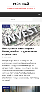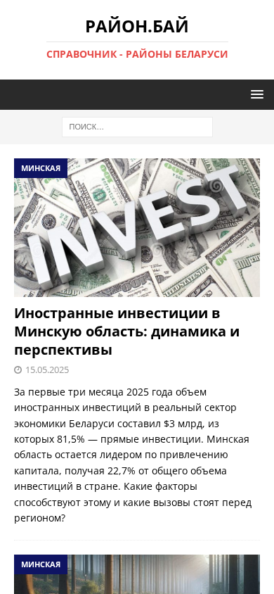 | AI-анализ | The web project "Район.бай | Справочник - Районы Беларуси" (rajon.by) is a reference guide for information about the regions of Belarus. It includes historical and geographical data, as well as useful links. The website's title translates to "Districts of Belarus" and its description mentions "information about regions" and "useful links." The top keywords are "район" (district), "минск" (Minsk), "область" (region), "2024," and various region names. The website features sections for each region in Belarus, including Minsk, and contains articles about various topics related to those regions, such as foreign investment in Minsk region and the production of an electric car in BelDZhi. The website also includes a search |